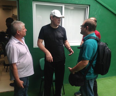 Henzel (c) conversa com colegas de imprensa na Arena Condá (Foto: Eduardo Florão)